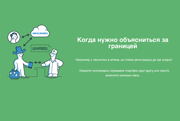 Abracadabra подбирает переводчика и связывает с ним. Выберите язык, специализацию, и он вам позвонит. После этого сможете общаться с собеседником, поочередно передавая смартфон друг другу или включив громкую связь. Специалист все переведет.
