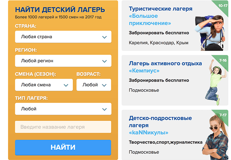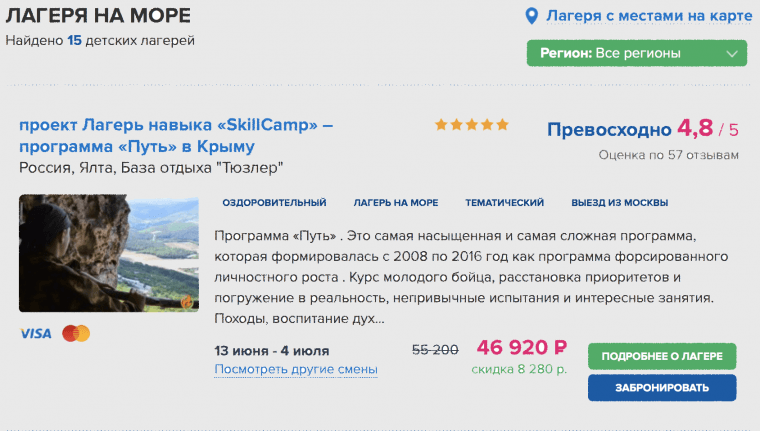 Доступно почти 3000 лагерей различной тематики, которые собраны в подборки. Например, тяготеет ребенок к творчеству — жмите «Творческие лагеря» и выбирайте нужный. Или отправьте его в языкой лагерь, и за несколько месяцев он здорово прокачает знания иностранного языка.