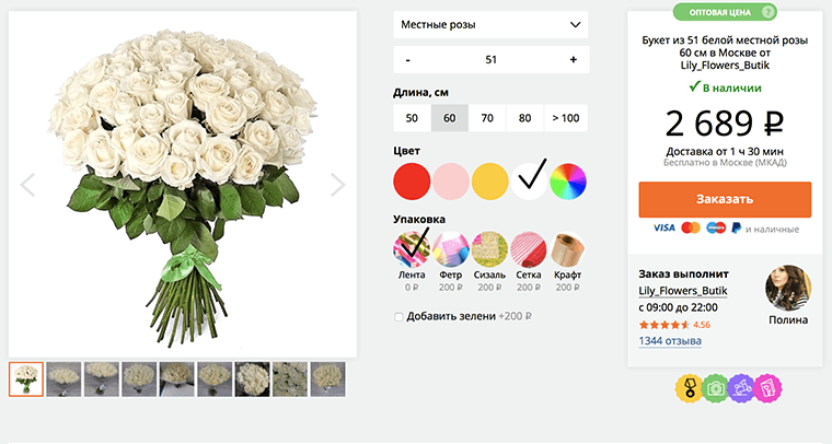 Чтобы не получить завядший веник, почитайте отзывы о цветочных магазинах и флористах. Каждый имеет рейтинг, фотографию флориста и каталог имеющихся цветов.