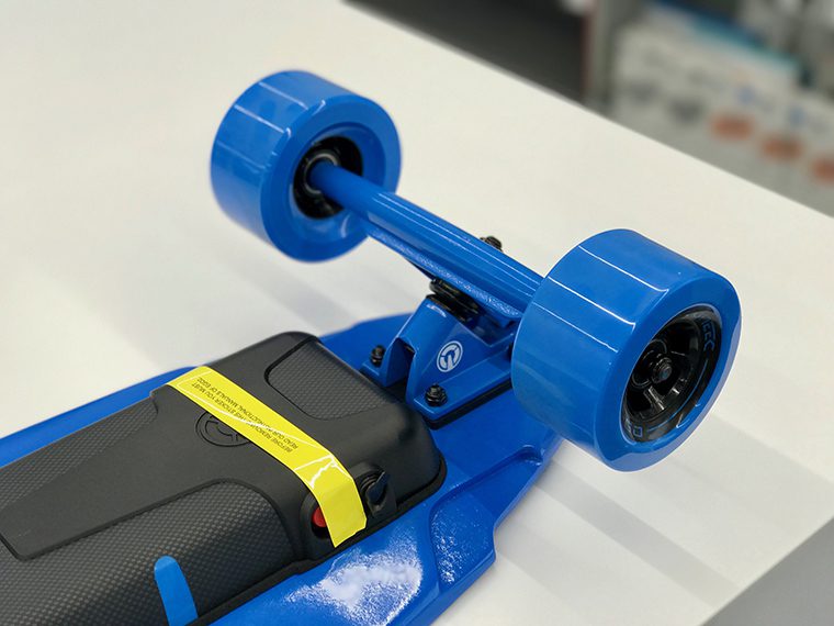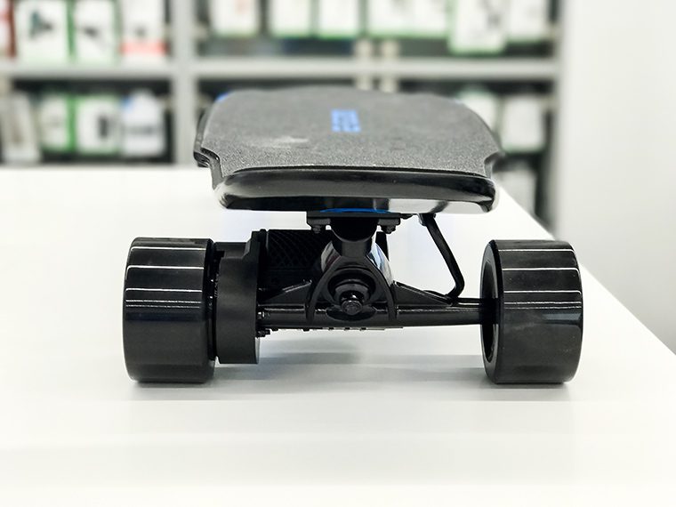 Запас хода — 30 км на одном заряде. Система рекуперации накапливает энергию во время торможения. Но даже если аккумулятор разрядился в ноль, можно кататься как на обычном скейте. Оттолкнулся ногой — и вперед!