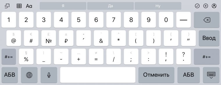 Буквы, цифры, символы и знаки препинания теперь находятся на одних кнопках, что позволяет уменьшить количество переключений раскладки. Чтобы вместо буквы выбрать нужный символ, достаточно просто провести по клавише сверху вниз.