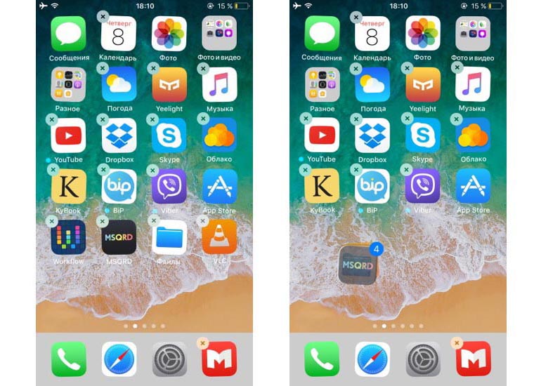 Просто зажимаем любую иконку для входа в режим редактирования, начинаем тянуть её и не отпускаем, после этого другим пальцем выделяем остальные нужные иконки.