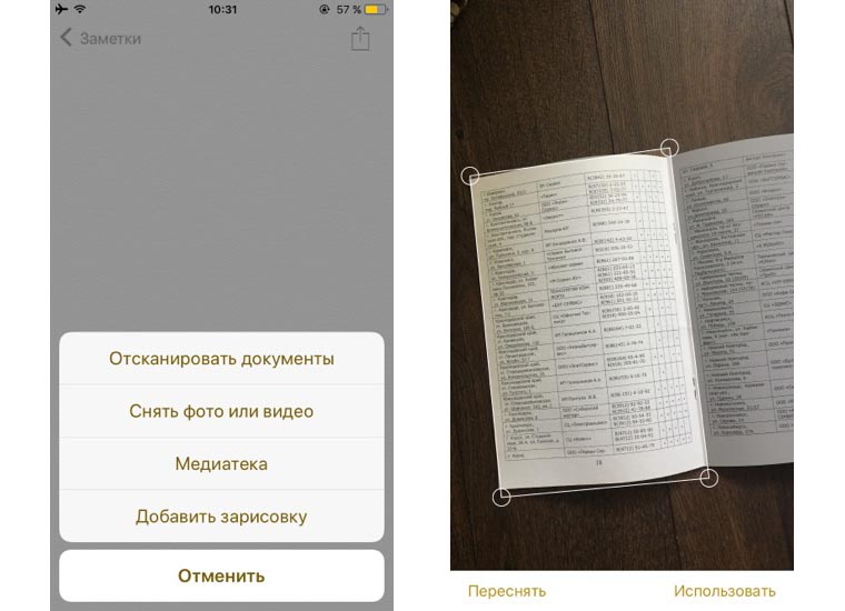 В приложении Заметки появился сканер документов. Достаточно нажать «+», выбрать соответствующую опцию и сфотографировать нужные данные. Система сама распознает страницу на фото и обрежет её, можно подкорректировать границы, переключиться между цветным и ч/б режимами.