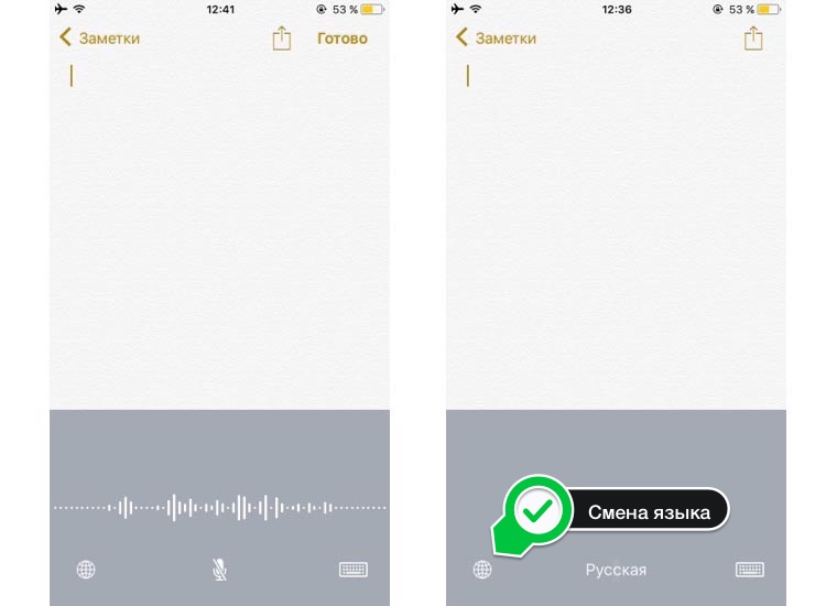 Можно начать говорить по-русски и в любой момент нажать на пиктограмму в левом нижнем углу, система продолжит распознавать речь на втором установленном в iOS языке.