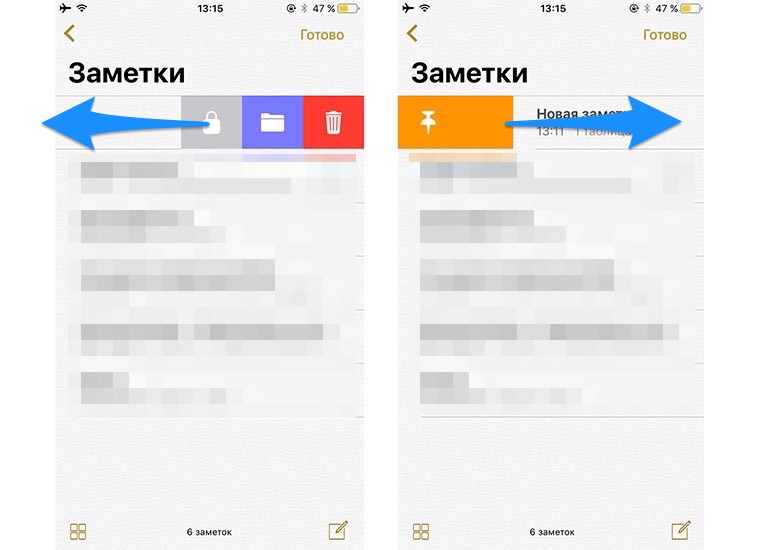 В общем меню с доступными записями появились боковые жесты. Свайп влево позволяет удалить заметку, переместить её в папку или установить пароль для просмотра, а свайп вправо закрепляет нужные заметки вверху списка.