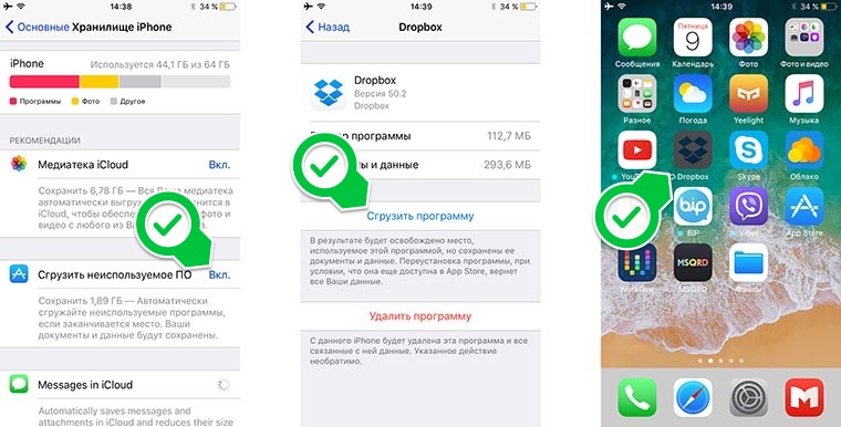 Для экономии места на устройстве можно временно выгружать приложения. По сути программы удаляются, чтобы не занимать место, а все данные и настройки сохраняются на устройстве.