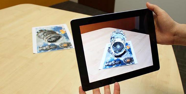 Довольно сложные и детализированные объекты в реальном времени накладываются на изображение с камеры смартфона или планшета. Устройство на 100% верно распознает положение плоскости (стола) в пространстве и строит композицию с учетом выбранного угла обзора.