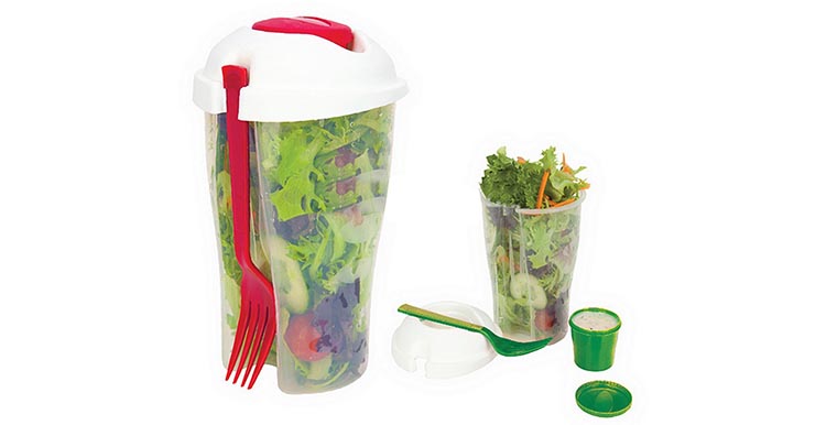 В нем удобно носить салаты на обед или для перекусов. Есть крепление для вилки и емкость для соуса, чтобы заправить непосредственно перед едой.