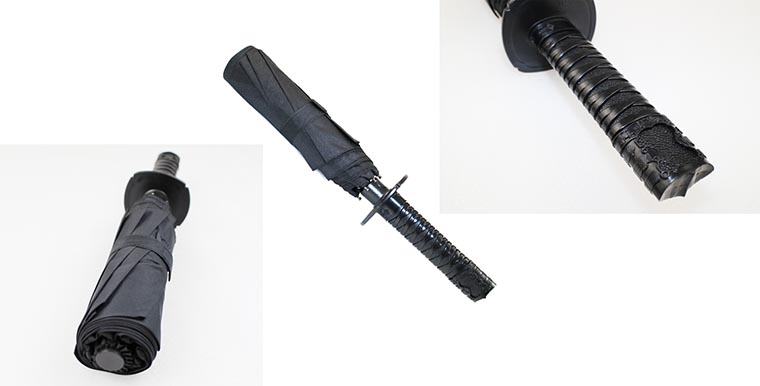 Миниатюрный оригинальный зонт с ручкой, стилизованной под холодное оружие. Он очень лёгкий и не занимает много места.