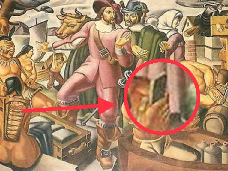 На ней изображён колонист Уильям Пинчон в Северной Америке и поселение индейцев, один из которых держит прямоугольную табличку, напоминающую iPhone.
