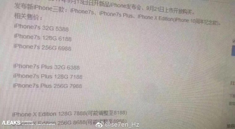 В китайской социальной сети Weibo появилась фотография, на которой показаны цены и объемы памяти iPhone 7s/7s Plus и 8.