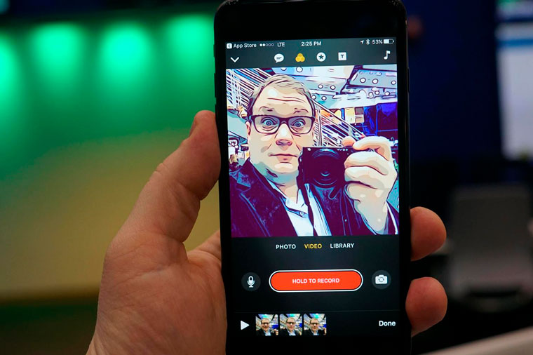 Собрать ролик в Clips просто: все кнопочки понятны, интерфейс предсказуем. Фишка приложения в том, что выбранные фото и видео не сразу попадают на линию редактирования: нужно нажать большую кнопку «Удерживать для записи» – сколько будешь держать нажатой кнопку, столько времени видео-файла и попадет в проект будущего «блокбастера».