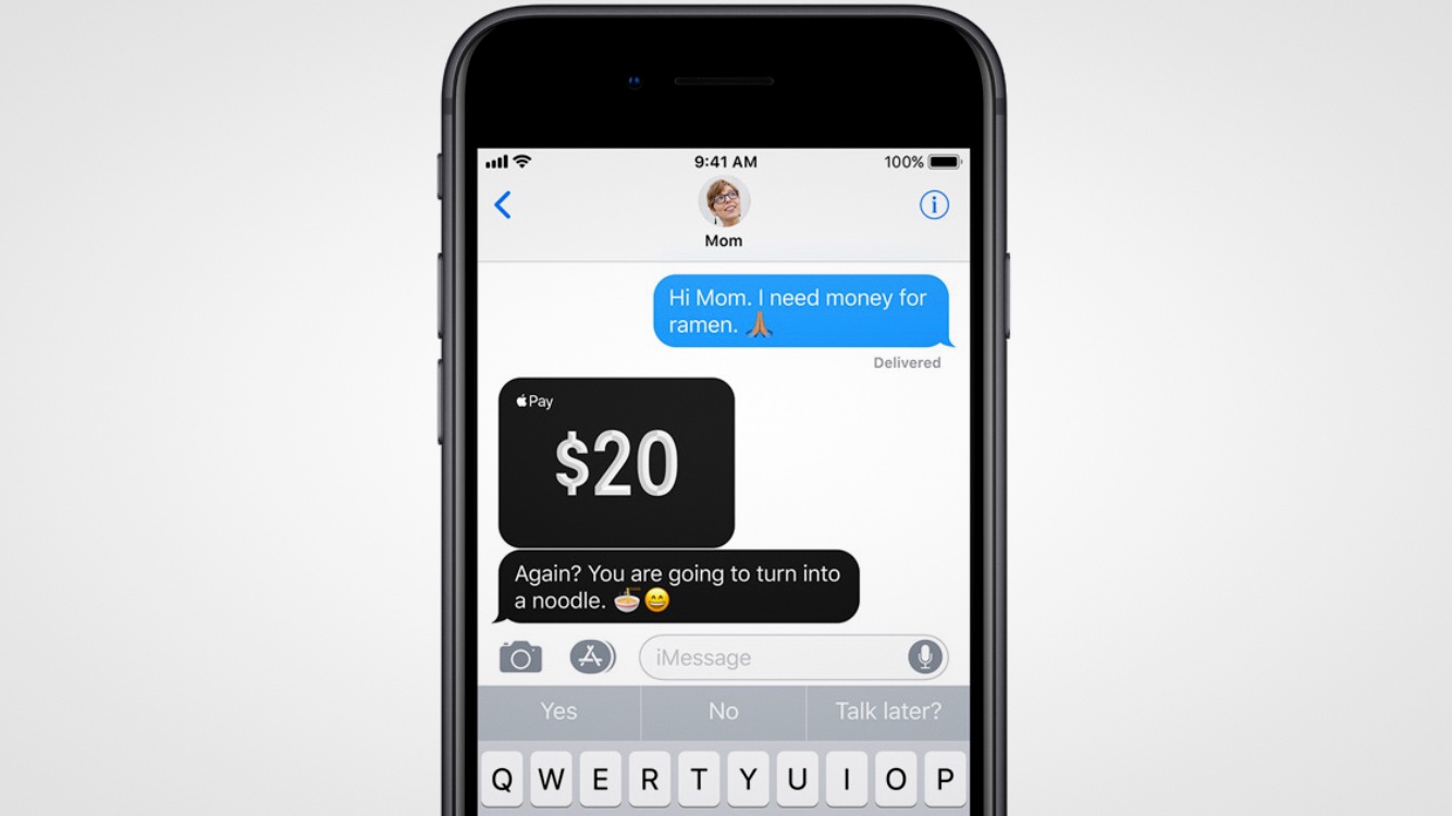 Технология позволяет переводить деньги, просто попросив их в сообщении iMessage. Собеседнику выведется кнопка для перевода средств.