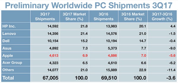 Несмотря на то, что у ASUS тоже не лучшая ситуация, она всё-таки смогла опередить купертиновцев с показателем в 4,9 млн компьютеров. А это 7,3% рынка.
