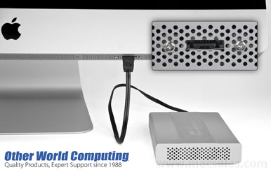 Когда iMac снова будет у вас дома, вы найдете там один eSATA порт, справа от слотов памяти. По их словам, ограниченное пространство внутри iMac не позволяет установить этот порт где-либо еще. После этого вы можете подключить свое eSATA-диск, используя гибкий кабель от OWC, которой вы получите после апгрейда.
