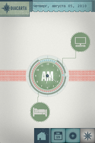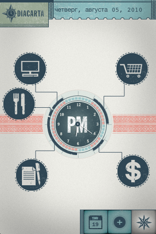 Diacarta представляет наш день в виде двух циферблатов. Первый отвечает за утренние часы (am), а второй — все оставшееся время после полудня (pm). В конечном итоге выглядит все это довольно любопытно. В центре экрана находятся часы, а от них в виде схемы отходят пиктограммы, обозначающие общую суть запланированного события. При желании, можно создать несколько окружностей с временными секторами.