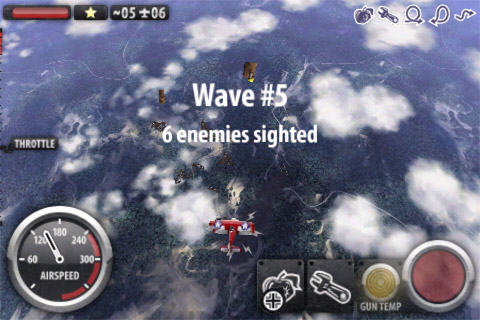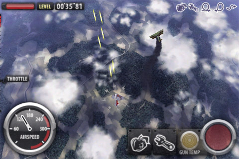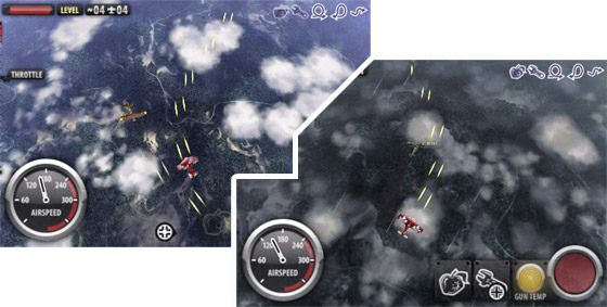 Управление очень простое: влево-вправо летим с помощью акселлерометра, стреляем тапом по большой красной кнопке. Желтый индикатор рядом показывет температуру пулеметов: когда они перегреты, вы остаетесь безоружными на некоторое время.