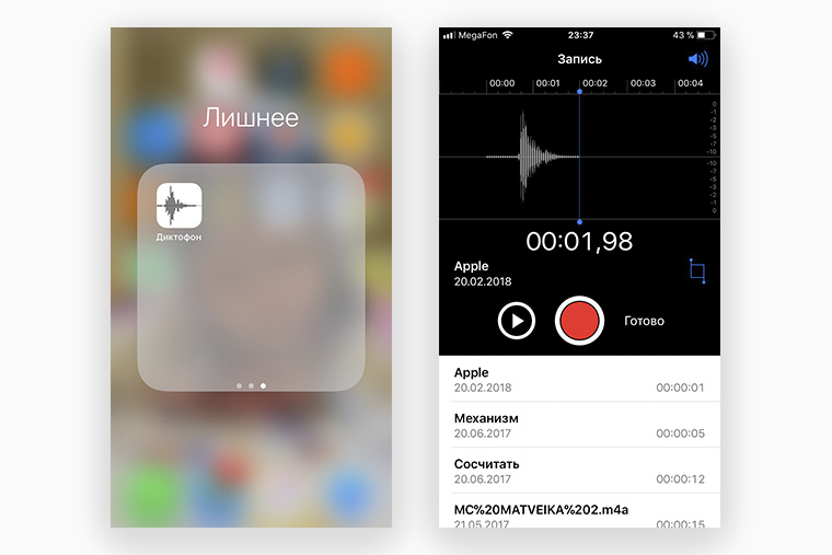Как найти: Папка «Дополнения» на рабочем столе iOS (а также «Лишнее», «Ненужное», etc.) —> приложение «Диктофон»