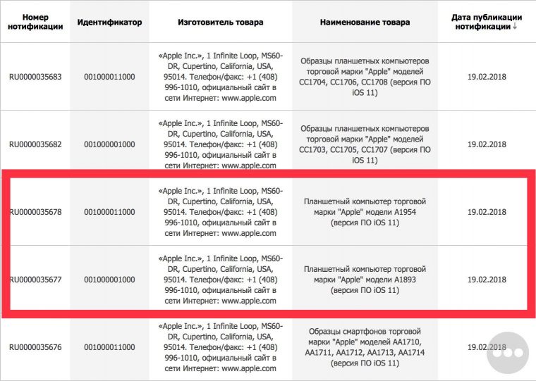 В списке продуктов — два новых устройства с идентификаторами A1954 и A1893. Они описываются как планшеты Apple под управлением iOS 11.