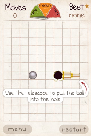 Разработка компании AppZap (Vision, PandoraBox) является головоломкой, которая состоит из 6-ти игр. Первая из них под название Telescope состоит из 112 уровней. У нас перед глазами листик из школьной тетрадки в клетку, на котором расположены маленькие телескопы, стальной шарик и дырка, в которую и нужно поместить тот самый шар. Тапаем на телескоп, он выдвигается и притягивает к себе сферу. Во второй игре Labyrinth необходимо пальцем провести дорожку зеленому квадратику. Сбились с пути? Начинаем все сначала. Сложность этой игры состоит в том, что нельзя “наезжать” на один квадратик игрового поля дважды.