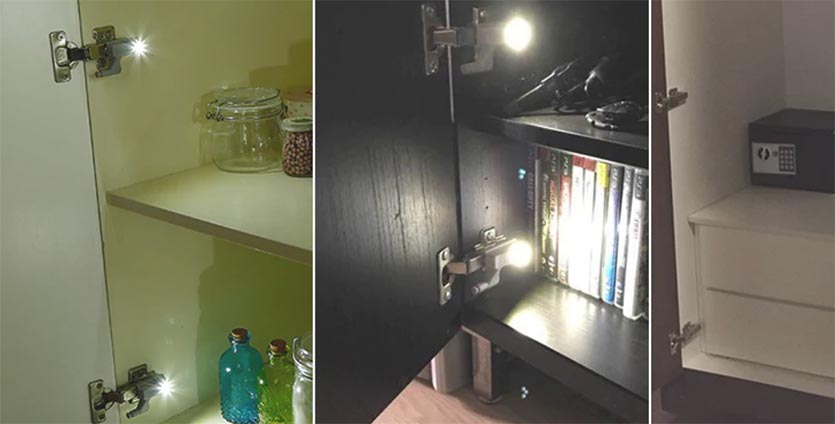 Компактный светильник с кнопкой крепится в любой шкаф или ящик и автоматически включается при открытии.