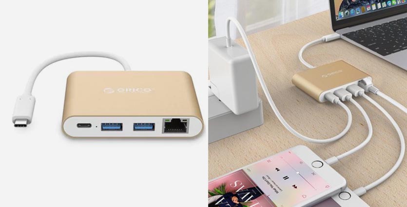 Многофункциональный хаб для современных смартфонов и компьютеров. Есть транзитный порт для зарядки, пара USB-A и встроенная сетевая карта для проводного подключения.