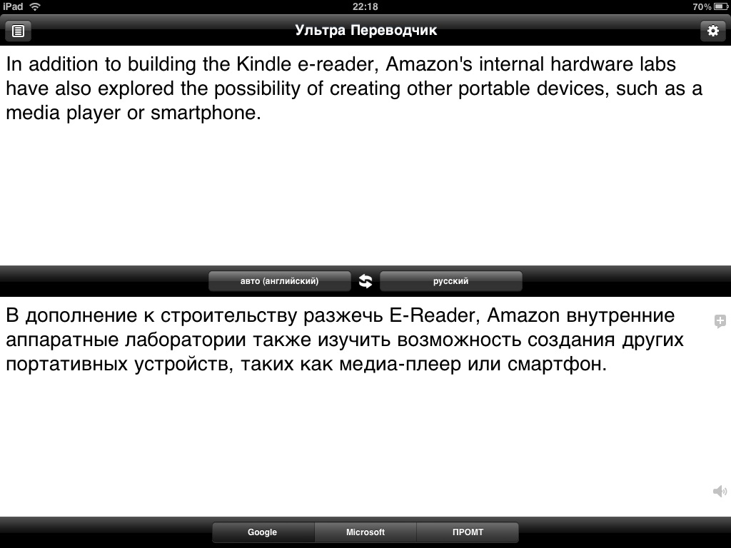 В отличии от словарей, которые могут дать исчерпывающую об одном слове, переводчики оказываются менее «многословными», но более умными. Их задача, используя данные словаря, подставить то значение слова, которое он посчитает самым подходящим в этом контексте. В сети можно найти три основных источника такого «интеллектуального» перевода. Первый — это великий и могучий Google. Затем идет чуть менее солидный Microsoft. И хромает на одной ноге с криками «Подождите!» PROMT. Приложение Ультра Переводчик выполняет одну простую, но довольно давно напрашивающуюся функцию — собирает все три переводчика вместе.