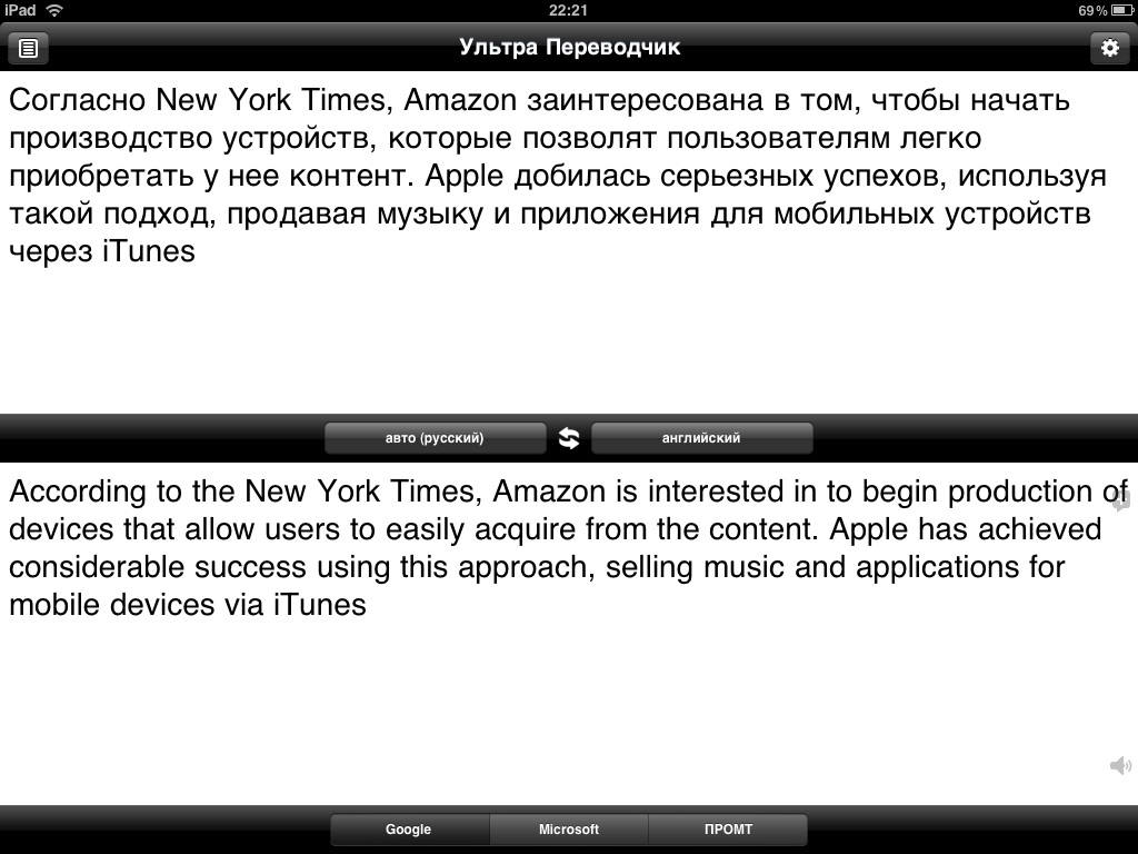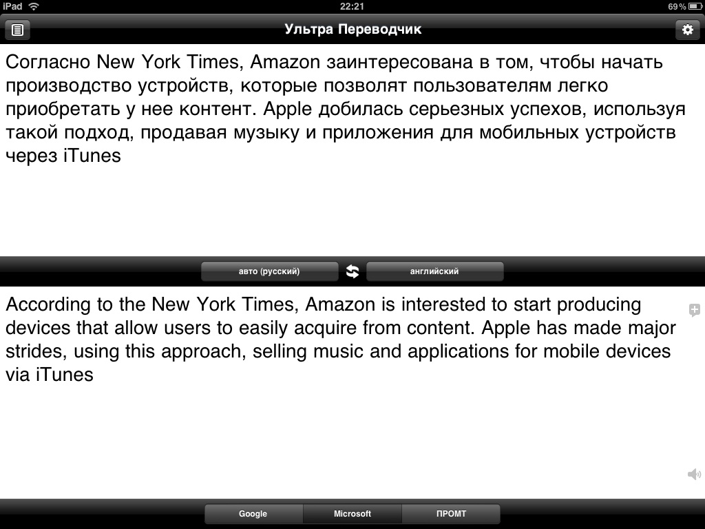 К сожалению, так как iPad пока не поддерживает многозадачность, использовать Ультра Переводчик на «таблетке» можно только в паре со стандартным Safari, хотя я предпочитаю браузер iCab Mobile. В будущем же, когда Apple выпустит iOS 4 для iPad, этот переводчик сможет стать отличным помощником для меня и многих других людей. В будущем хотелось бы получить возможность отправлять текст на email из приложения, а также увидеть кнопку «перевести» на серединной полоске, а не только на клавиатуре.