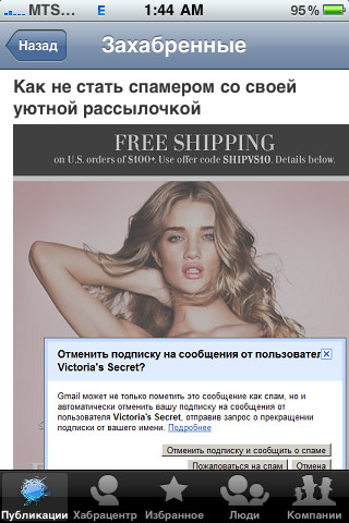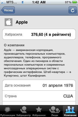 В “Избранном” хранятся ваши любимые посты. Этот список синхронизируется с основной версией сайта. Поэтому очень удобно утром, выходя из дому, отметить понравившиеся статьи, а по дороге на работу или учебу их прочитать. Впрочем, локального списка “Избранного” нет… Во вкладках “Люди” и “Компании” можно посмотреть профили блоггеров и известных в сфере IT компаний соответственно. Информация здесь расположена удобно, нет ничего лишнего.