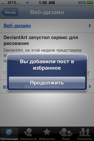 Делаем выводы: как для первой версии, клиент получился довольно приятным. Несомненно, читать “хабру” с айфона довольно неудобно, а “мю-хабра” (мобильная версия сайта) отличается очень ограниченным функционалом. Клиент для iPhone стал чем-то средним: нужный функционал всегда под рукой, но иногда чего-то не хватает или же что-то реализовано не так, как ожидалось. Как активный читатель, приложение оставляю на первой вкладке , но в следующих версиях жду от разработчиков кэширование статей, удобную подгрузку их списка, исправленный интерфейс в “Хабрацентре” и локальный список “Избранного”.