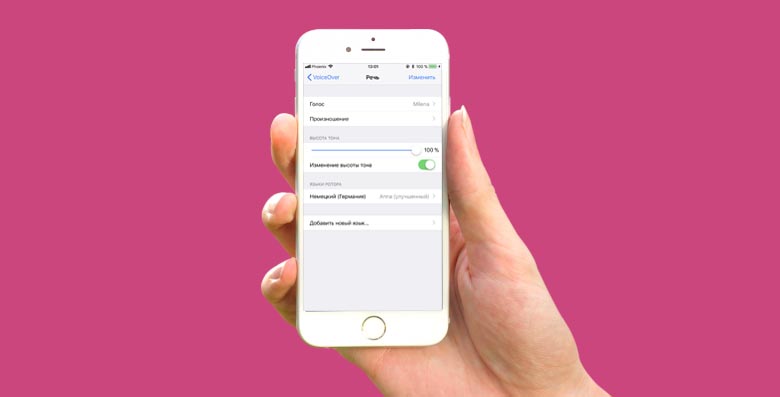Не забываем зайти в меню Настройки – Основные – Универсальный доступ – VoiceOver – Речь, выкрутить на максимум Высоту тона и включить Изменение высоты тона. Так получим самый невероятный голос.