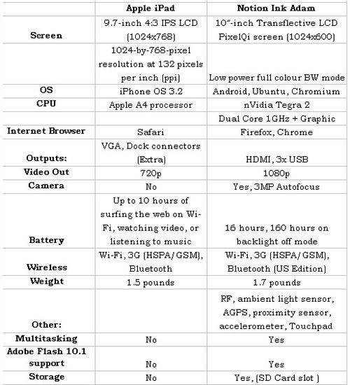 Adam обещает быть напичканным передовой электроникой, включая полупрозрачный дисплей Pixel Qi и мощный графический чип Nvidia Tegra 2. Pixel Qi может поглощать свет от внешних источников, чтобы подсвечивать экран, что должно помочь снизить расход энергии и продлить время жизни батареи. Чипсет Tegra, в свою очередь, позволит планшету воспроизводить Full-HD 1080p видео, в то время как iPad может позволить себе только 720p.