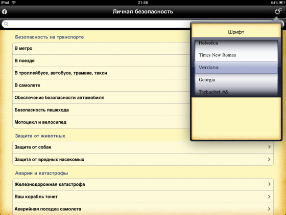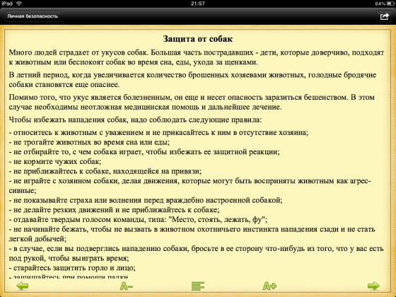 Не буду слишком углубляться в содержание статей, а вместо этого расскажу о том, как вся эта информация представлена. Приложение имеет своего рода встроенную читалку, которая позволяет сделать процесс чтения более удобным. Нам предлагают настроить шрифт и его размер. При желании любую статью можно отправить на email, не покидая приложение. Кроме того, с помощью встроенного поиска можно найти интересующую информацию по заголовку или содержанию.