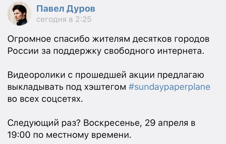 Кроме того, чтобы все смогли поддержать акцию правильно, создатель Telegram попросил ставить у каждой подобной публикации хэштег #sundaypaperplane. Кажется, скоро это станет еженедельной традицией по всей России.