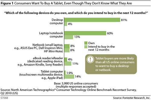 Последнее исследование аналитической компании Forrester, проведенное среди американских пользователей компьютерной техники и гаджетов, показало довольно забавные результаты, касающиеся планшетов. Оказывается, это наиболее популярная категория товаров, запланированная к приобретению в ближайший год. 14% опрошенных пользователей в течение 12 месяцев планируют купить iPad или схожий планшет, в то время как нетбук попал в годовой бюджет лишь 8%.