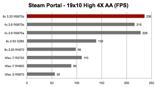 Три первых результата — Radeon 5870, далее в порядке уменьшения производительности идёт чип Geforce G285, Radeon 4870 и прочие. Как видите, с новой видеокартой прирост видеопроизводительности действительно налицо.