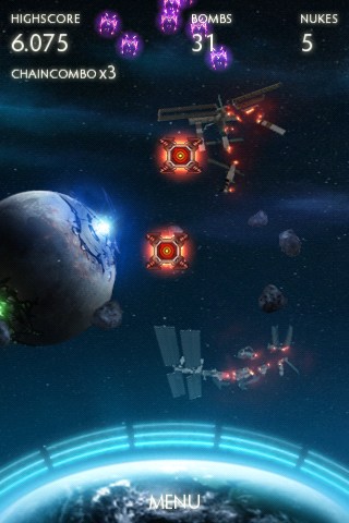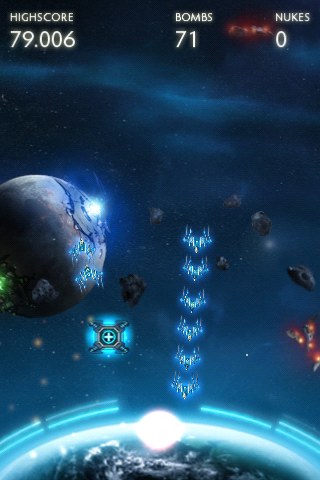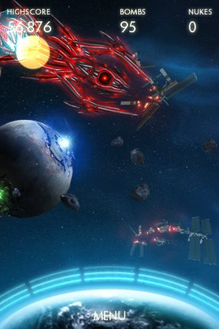 В конце каждого наплыва инопланетян будет появлятся огромных размеров босс, которого можно победить только в несколько атак. Иногда я не справлялся с нахлынувшими врагами и вынужден был применять ядерное оружие, после которого ни один из нападавших не выживал. Для этого нужно просто встряхнуть iPhone.