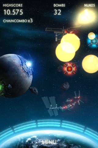 С первого тапа игра заработала и перенесла меня в космос, откуда я должен бороться с инопланетными захватчиками. Должность, конечно, ответственная и опасная, но отступать было поздно. В моем арсенале оказалось несколько типов оружия, которое, как мне пообещали, должно постоянно пополняться благодаря летающим в космосе бонусам. Самыми многочисленными оказались желтые бомбы. Когда Землю (она находится в самом низу экрана) атакуют гуманоиды, необходимо одним тапом поставить несколько бомб и все они будут уничтожены. Более серьезные летательные средства можно испепелить выстрелом с поверхности планеты — просто тапните на космолёт и тот разлетится от электрического разряда.