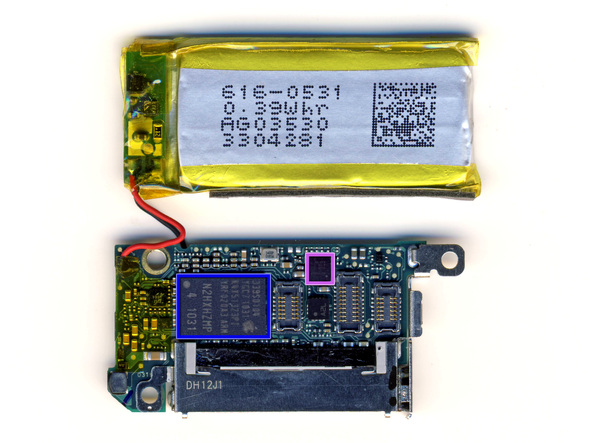Shuffle и Nano имеют практически идентичные корпуса — никаких винтов снаружи нет. Поэтому разбирать его пришлось аналогичным, не самым гуманным способом. В ход снова пошел строительный фен. Как выяснилось, стекло экрана приподнято над самим корпусом из-за экономии места — оно нужно для разъема 3,5 мм (наушники). Всё самое интересное оказалось внутри.