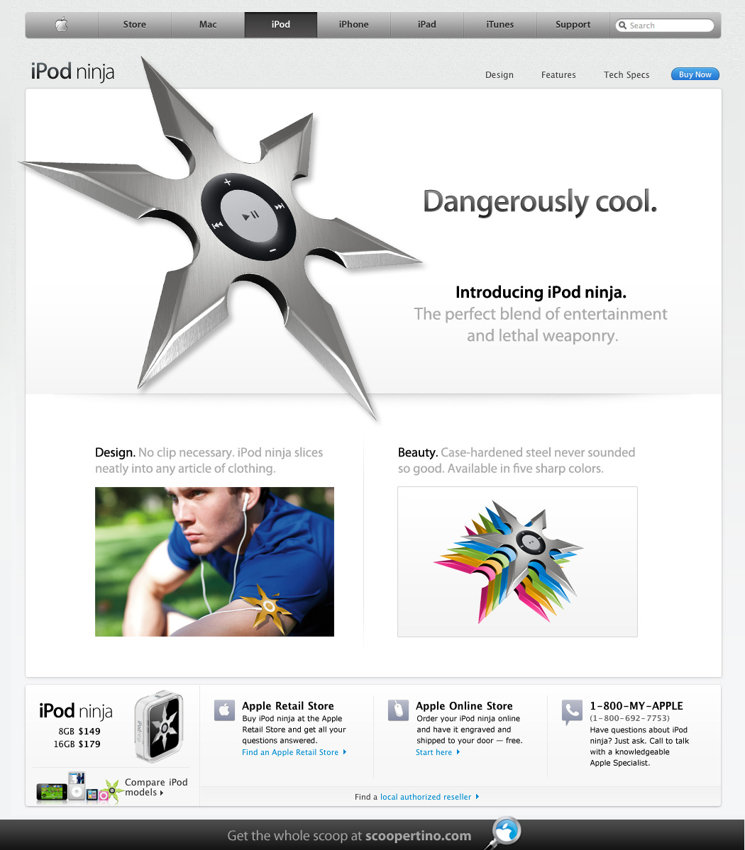 «iPod ninja как нельзя лучше вписывается в этот зияющий пробел между iPod Touch и небольшим пистолетом», — говорит представитель Apple Тэд Ветмор (Ted Wetmore). Устройство подарит вам спокойствие. Вы можете наслаждаться музыкой или бросить его в любого, кто дерзко на вас посмотрит. После небольшой тренировки вы без труда устраните недоброжелателя на расстоянии до 50 футов.»