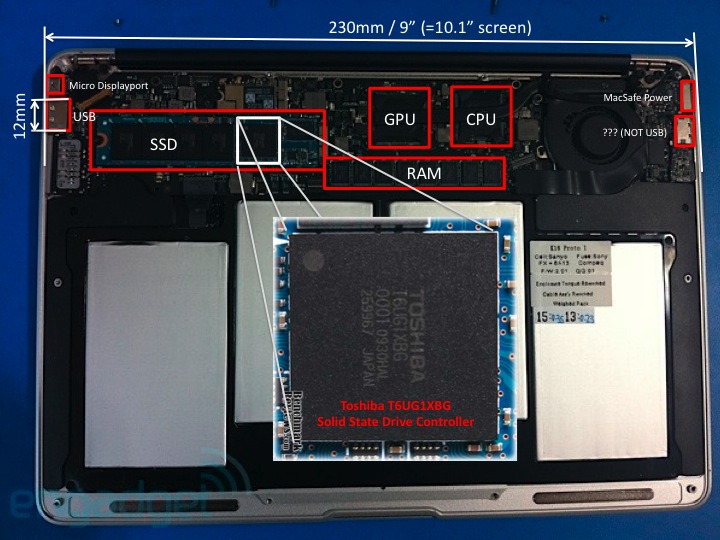 В распоряжение техно-блога Engadget попали два крайне интересных изображения. Первое — некий ноутбук без задней крышки и всеми «внутренностями» наружу. Уже по одной рамке корпуса видно, что перед нами явно творение из Купертино, и дальнейший анализ увиденного только подтверждает наши догадки: