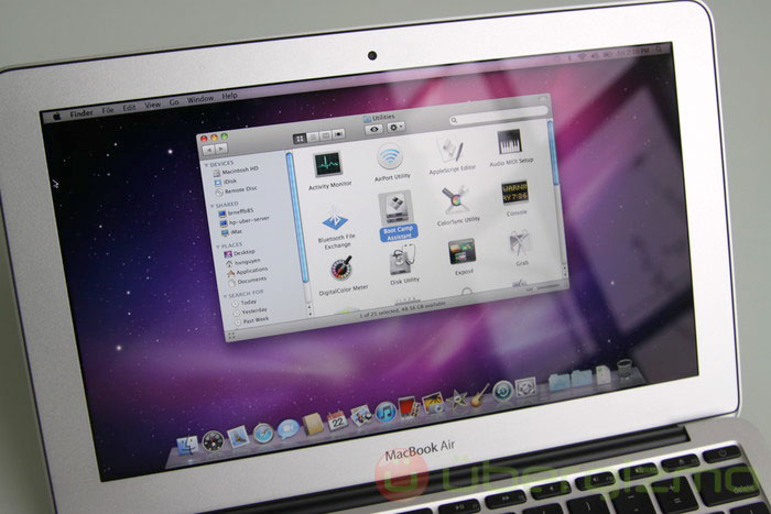 Обозреватель Ubergizmo испытал 11,6-дюймовый аппарат в работе с Windows 7 и отметил, что Air прекрасно может заменить какой-нибудь сверхпортативный Sony Vaio. В среде альтернативной для себя ОС лэптоп работает уверенно и, кстати, тоже долго. Просыпается не за секунду как в Mac OS X, но за три, что вполне неплохо. В режиме веб-серфинга функционирует около шести часов, что лишь на час меньше Mac-теста, а HD-видео в обоих ОС он без подзарядки воспроизводит в течение 3,3 часов.