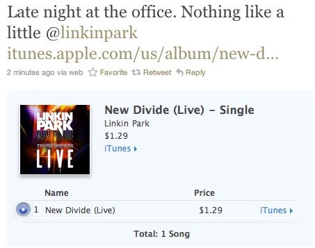 Разработчики Twitter пошли еще дальше и внедрили в каждый «твит» из Ping функцию предпросмотра. Щелчок — и чуть ниже открывается небольшой сегмент из iTunes Store с названием альбома, песней, предварительным прослушиванием и тому подобными радостями жизни. Не верите? Попробуйте сами. Только учтите, что эти вкусности доступны только при включении в настройках последней, двухпанельной версии Twitter. [twitter blog]