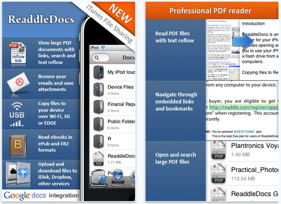 Игорь Жаданов «обнулил» свое детище, которое понимает большинство документов: Word (doc, docx), Excel (xls, xlsx) и Powerpoint (ppt, pptx); TXT; FB2; RTF; HTML; PDF и т.д. В ReaddleDocs можно сохранять аттачменты из почты, чтобы затем читать в оффлайне, переносить документы по Wi-Fi/EDGE/3G, сохранять документы из интернета за счет встроенного браузера, подключаться к iDisk, Dropbox, GoogleDocs. Плюс к этому полнотекстовый поиск, паролирование файлов, zip/unzip своими силами, чтение огромных PDF, фулскрин и прочее. [10x Даниал Сиддики]