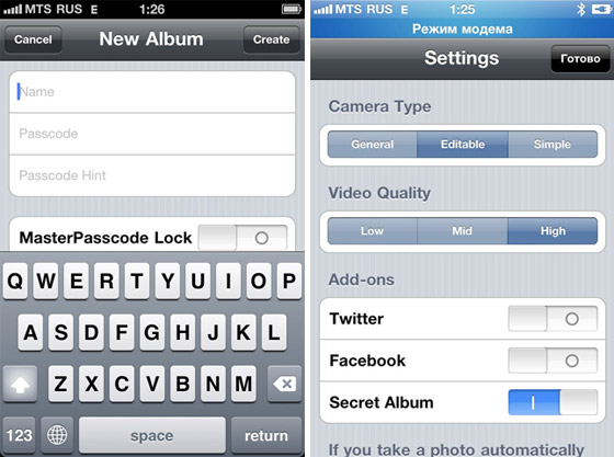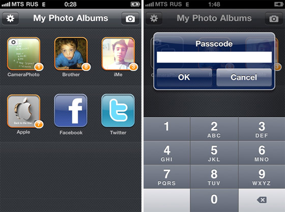 Хотелось бы рассказать про еще одну интересную функцию программы- это так называемый секретный альбом. Включить его вы можете в настройках и, выключив его, фотографии оттуда не удаляются. Альбом не указан в существующих, а доступ к нему вы получаете достаточно своеобразным образом- надо 3 раза легонько потрясти iPhone и вылезет поле, в котором нужно будет ввести пароль. Секретный альбом имеет все те же возможности, что и любой другой, однако, он секретный.