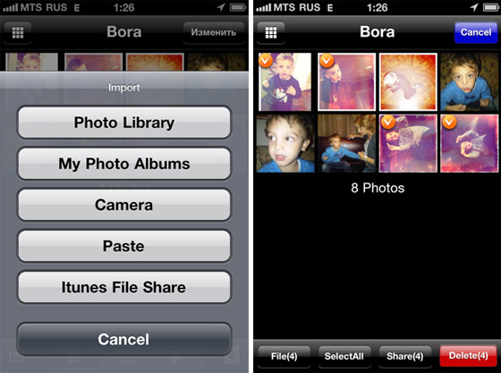 Слева мы видим привычную нам кнопку для начала отметки фотографий. Есть возможность отметки всех сразу. Выделенные фотографии мы можем отправить по почте, причем в неограниченном количестве (что хорошо, так как из “родных” фотографий мы можем отправить максимум 5) можем отправить по MMS, перенести в папку CameraRoll, добавить в список синхронизации с iTunes, переместить в другой альбом, или скопировать.