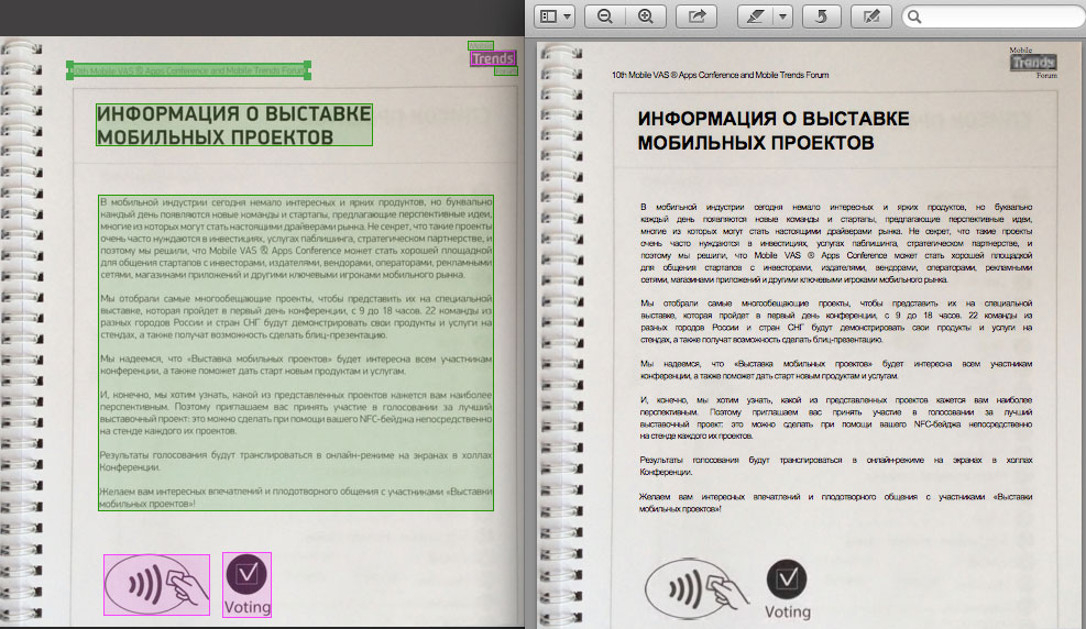 Причем в последнем случае я буквально в один клик выровнял картинку, еще пара нажатий — и убраны лишние поля, затем клик на кнопку «Распознать», после чего программа определила, где находится текст, а где изображения: