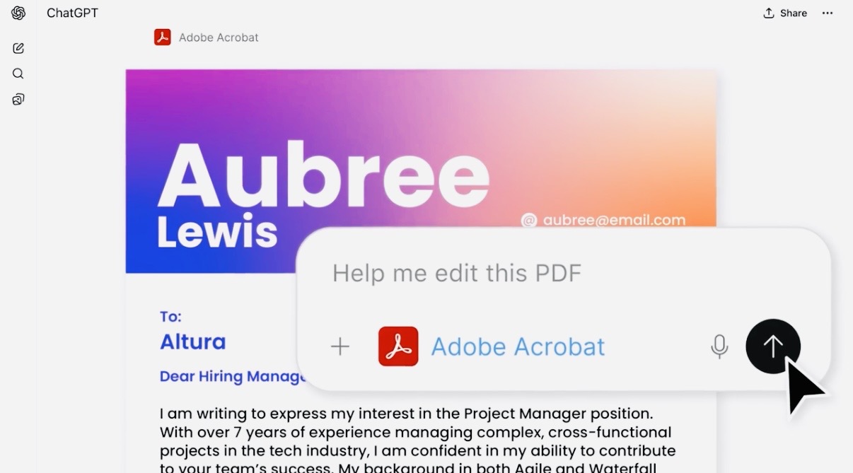 Как работает: пользователь загружает в ChatGPT изображение, дизайн-элемент или PDF-документ. В зависимости от запроса, ChatGPT автоматически вызывает нужное приложение Adobe.