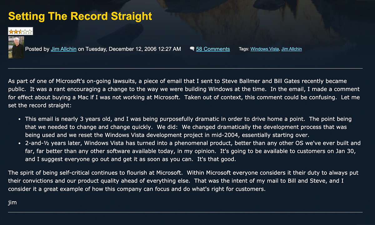 В нём он говорит, что самокритика является важной составляющей Microsoft и что его резкое письмо было лишь призывом глав компании к переменам. Ещё похвалил Windows Vista, назвав её лучше операционной системой на рынке.