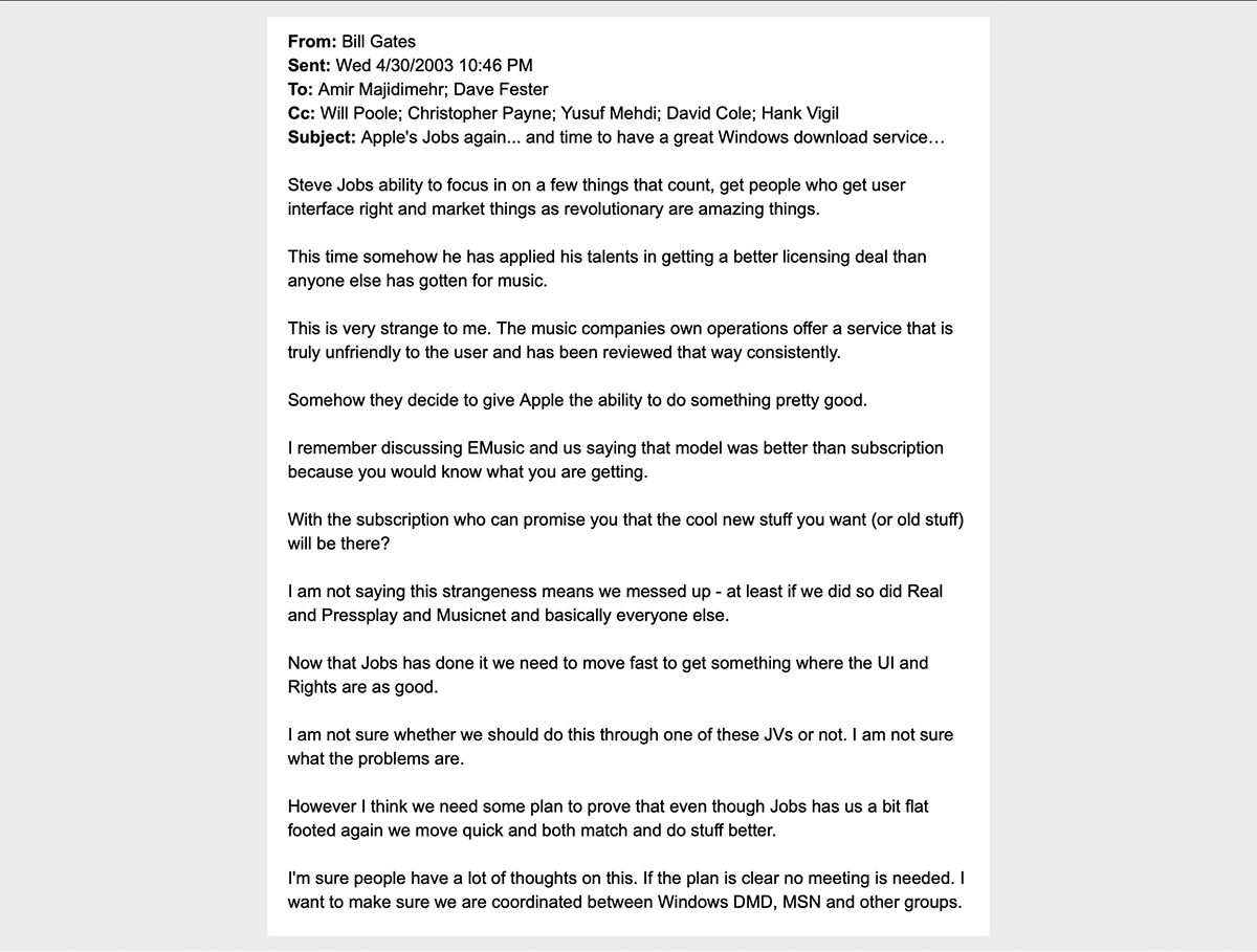 В 2003 году Apple запустила цифровой магазин музыки iTunes Store. Билл Гейтс обеспокоился очередным прорывом Apple и написал топ-менеджерам Microsoft небольшое письмо с рассуждениями.